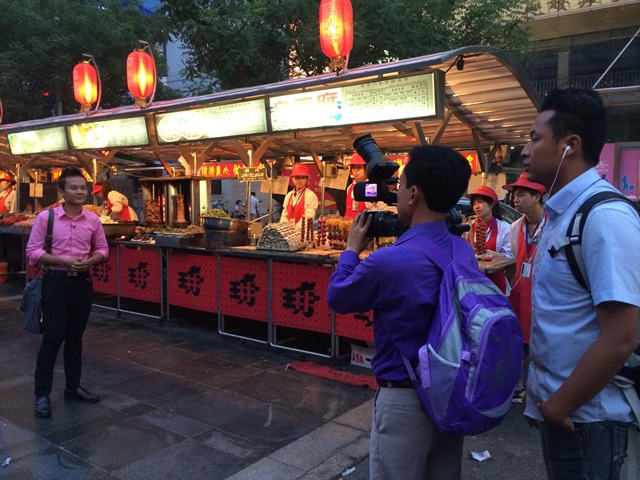 摄制组在拍摄王府井小吃街