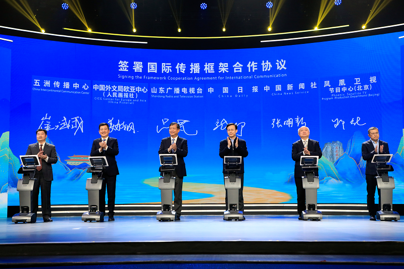中国日报、中国新闻社、中国外文局欧亚中心、五洲传播中心、凤凰卫视节目中心的代表,与山东广播电视台签署国际传播框架合作协议