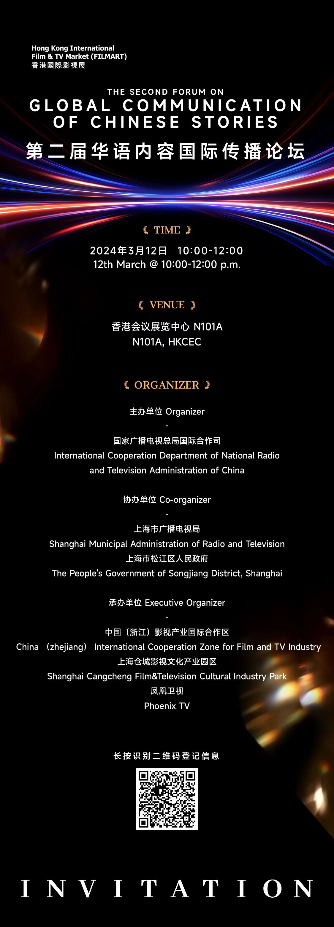 3月12日,香港国际影视展(Filmart)期间,由国家广播电视总局国际合作司主办,上海市广播电视局、上海市松江区人民政府协办,中国(浙江)影视产业国际合作区、上海仓城影视文化产业园区、凤凰卫视承办的“第二届华语内容国际传播论坛”将在香港会议展览中心举办。
