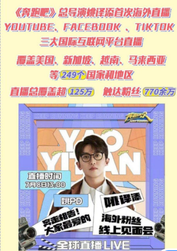 尤其是2022年-2023年期间,雅文传播先后策划了《奔跑吧》马来西亚线下粉丝互动体验见面会、导演姚译添的全球直播秀等活动,以“线上+线下”的形式展开,将《奔跑吧》IP全矩阵在国际市场的影响力推向了新的高度。截至2024年4月,《奔跑吧》节目在海外曝光量已超过200亿,YouTube及Facebook平台订阅户数已突破300万,全面覆盖美国、新加坡、越南、马来西亚等海外200多个国家和地区,深度影响海外粉丝近千万。
