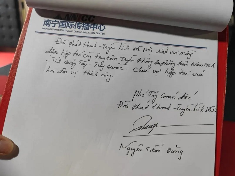 阮进勇手写留言:河内广播电视台非常高兴能够与南宁国际传播中心合作,祝双方合作取得成功。
