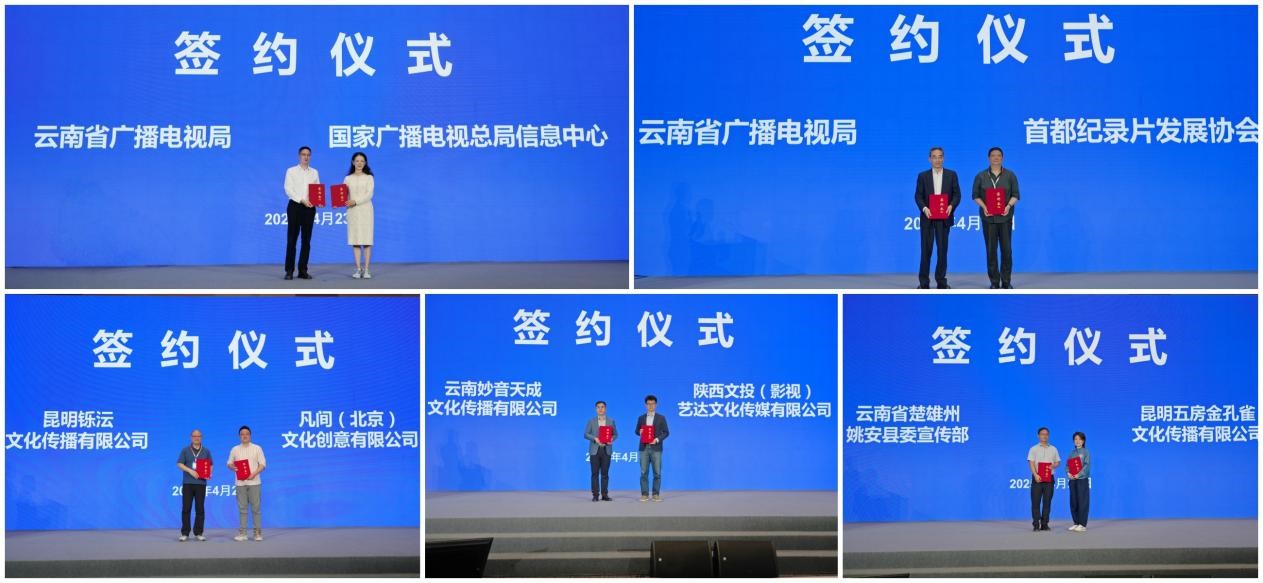 云南省广播电视局分别与广电总局信息中心、首都纪录片发展协会签订战略合作框架协议和合作备忘录,电视剧《民族大义》《赤心》,微短剧《花自向阳开》制作机构分别与合作机构签署了相关协议。