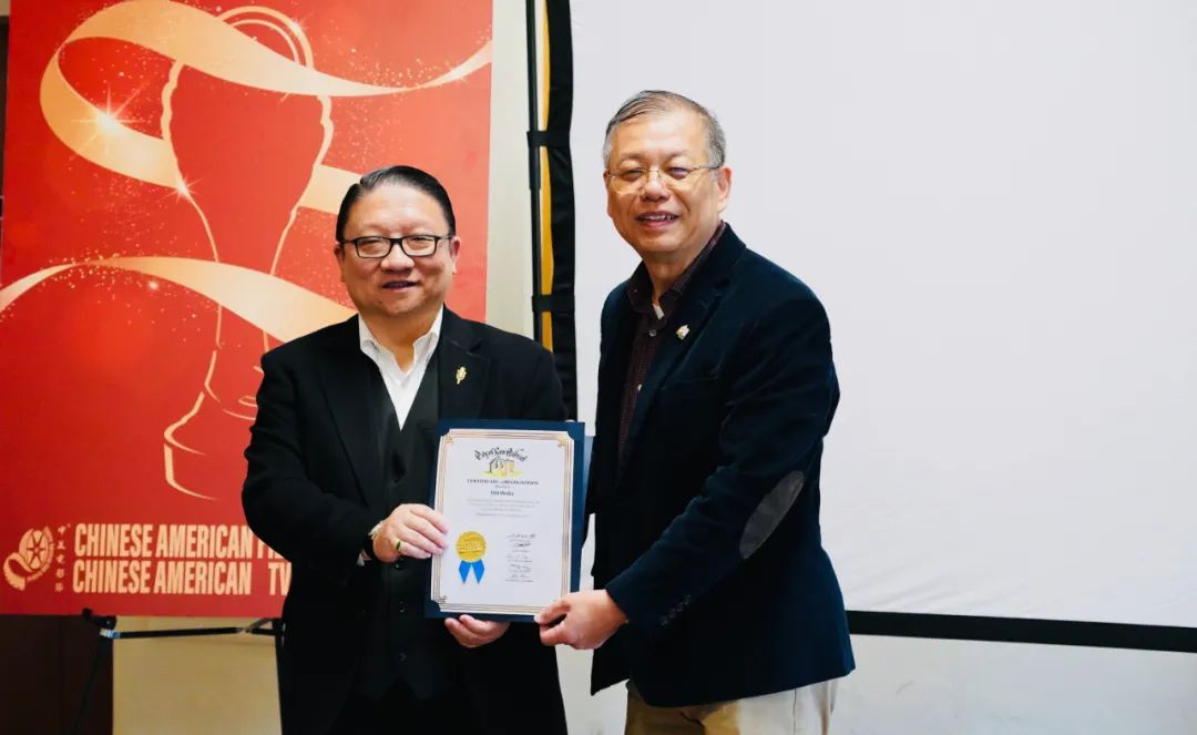 市议员丁言愉代表市政府为中美电影节中美电视节主席苏彦韬颁发感谢状