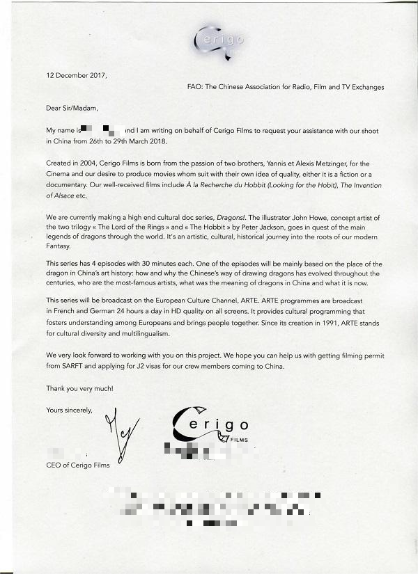 2.1. 一份用信笺纸书写并有签名的申请函。该函应包括:公司/电视台以及拟拍摄的纪录片简介、拟播出时间和播出平台、摄制组成员、预计入境和出境日期;