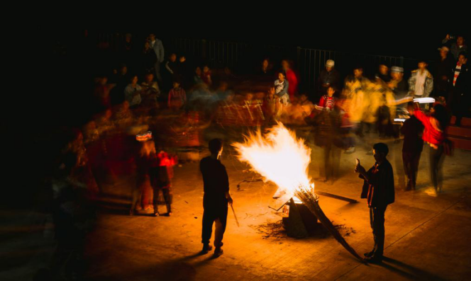 一年一度的火把节上,村里所有人围在一起,点燃火把,载歌载舞。