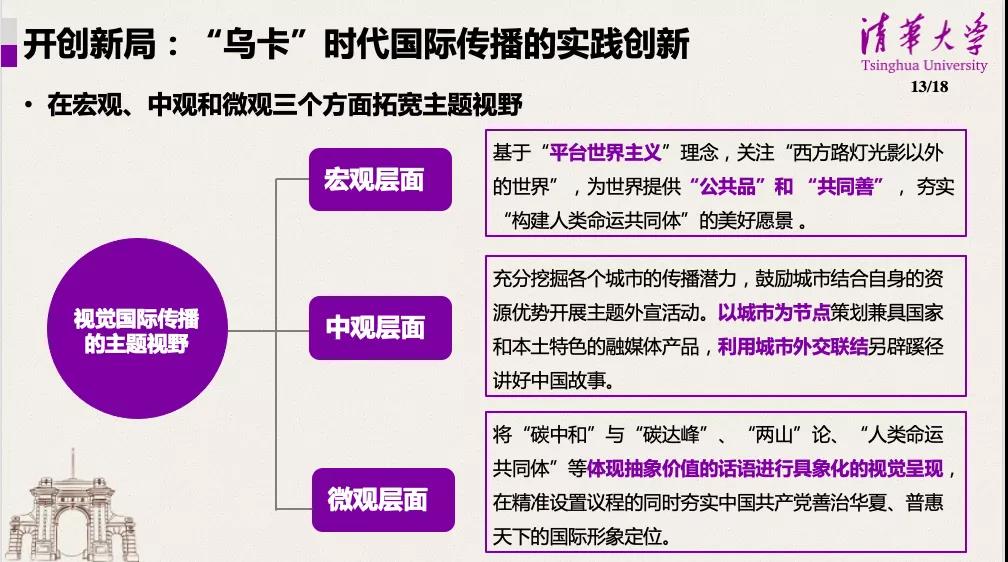 二是应在宏观、中观、微观三个方面拓宽主题视野。在宏观层面,基于“平台世界主义”理念,关注“西方路灯光影以外的世界”,为世界提供“公共品”和“共同善”;在中观层面,注重利用城市外交联结另辟蹊径讲好中国故事;在微观层面,将“碳中和”、“生物多样性”等体现抽象价值的话语进行具象化的视觉呈现。