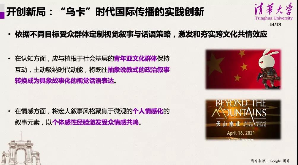 三是应依据不同目标受众群体定制视觉叙事与话语策略,从认知和情感两方面激发和夯实跨文化共情效应。在认知层面,与青年亚文化保持互动,将抽象说教式的政治叙事转换成为具象故事化的视觉话语表达。在情感层面,可尝试将宏大叙事风格聚焦于微观的个人情感化的叙事元素,以个体感性经验激发受众情感共鸣。