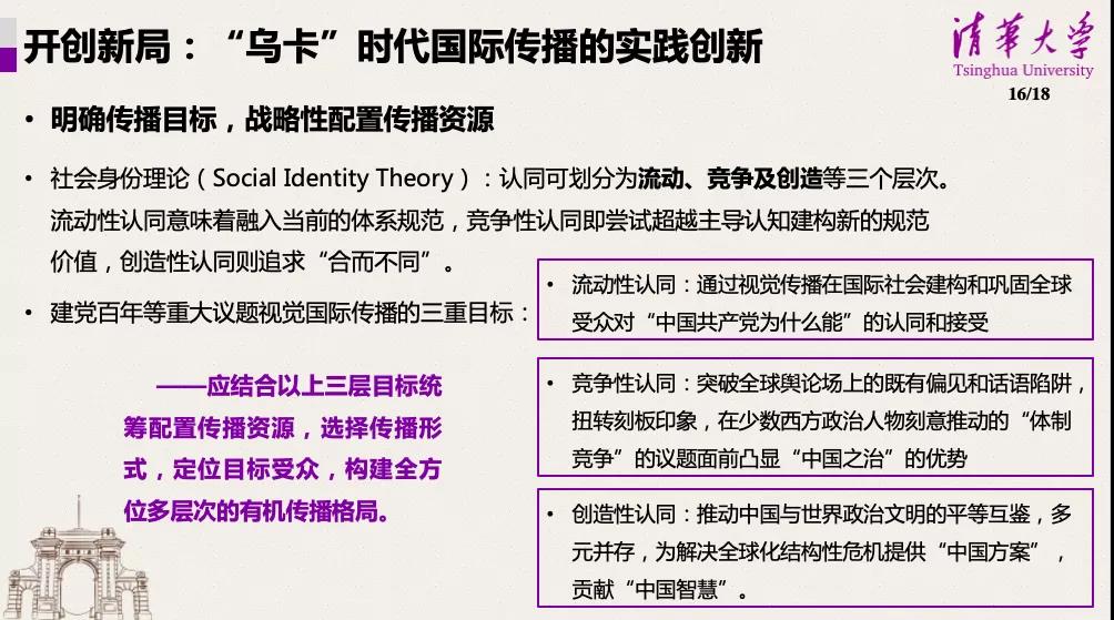 五是应明确传播目标,战略性配置传播资源。从社会身份理论来看,我国国际传播的核心目标即全球身份认同的构建,可划分为流动、竞争与创造三个维度。在战略传播思维下,应结合以上三层目标统筹配置传播资源,选择传播形式,定位目标受众,构建全方位多层次的有机传播格局。
