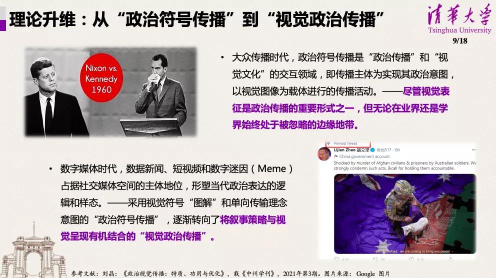 在理论升维方面,首先聚焦于增强国际传播实践的整合导向和目标导向。一方面,把国际传播工作上升到国家战略层面,由主管部门作为主导力量来进行战略传播的规划和实施,尽快建立适合我国国情和内政外交需求的国家战略传播机制。另一方面,将“传播”环节前置,让“传播”进入决策环节,更为及时、准确、深入地阐释党中央的治国理政新理念,增强对外舆论工作的影响力和有效性。其次,从过去采用视觉符号“图解”和单向传输理念意图的“政治符号传播”,逐渐转向将叙事策略与视觉呈现有机结合的“视觉政治传播”,即注重政治话语表达和呈现形式的不断创新,借助全球性社交媒体平台实现“病毒式传播”,以寻求更广泛的国际政治认同和公众参与的网络化、社交化的政治传播。