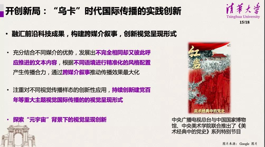 四是应融汇前沿科技成果,构建跨媒介叙事,创新视觉呈现形式。一方面要充分结合不同媒介的优势,通过跨媒介叙事推动传播效果最大化。另一方面,注重对不同视觉传播样态的创新性应用,持续创新建党百年等重大主题视觉国际传播的的视觉呈现形式。