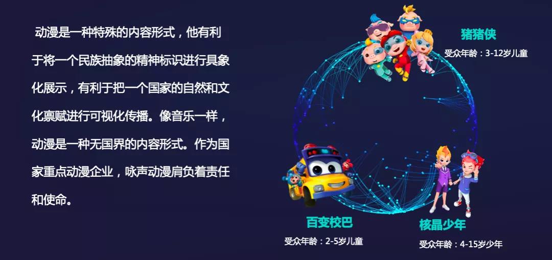 动漫是一种特殊的节目内容形态。这种内容形态可以将一个民族一个国家抽象的精神文化或精神标识进行具象化表达和可视化传播,而且是一种无国界的内容形式,适合进行国际传播。咏声动漫深耕文化行业35年,形成了以原创动漫IP为核心、以3D动画制作技术研发为基础、覆盖“动漫内容制作-动漫内容发行-动漫衍生内容、产品和服务”全产业链的业务体系,是全国文化30强提名企业、国家重点动漫企业及高新技术企业,其动画节目发行到全球50多个国家和地区。