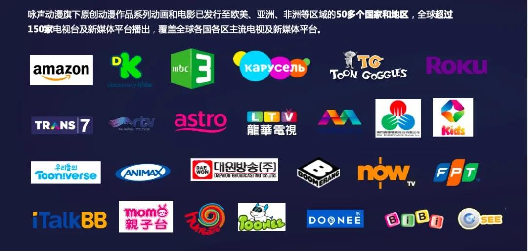 目前,咏声动漫旗下原创系列动画电视和电影已发行至欧美、亚洲、非洲等区域的50多个国家和地区,覆盖全球超过150家主流电视及新媒体平台。其中,《猪猪侠》《逗逗迪迪》等系列动漫大电影译制成英语、韩语、西班牙语、越南语等多种语言,配合当地宣发策略进行本土化包装,在全球各地院线上映,有效扩大动画节目的国际传播力和国际影响力。此外,咏声动漫在2019年推出全新IP《百变校巴》系列动画也被译制成英语、俄语、韩语、印尼语、马来语、希伯来语、印度语、越南语等十几种外语,在各区域主流媒体及YouTube平台上线,覆盖全球各大区域,合作伙伴包括俄罗斯第一电视台Carousel, 乌克兰电视台,韩国Tooniverse,华纳Boomerang, 马来西亚ASTRO, 印尼RTV,越南BIBI和SCTV等等。该系列动画的俄语版配音和韩语版配音节目在YouTube上线三周内,播放量突破百万,备受观众好评。