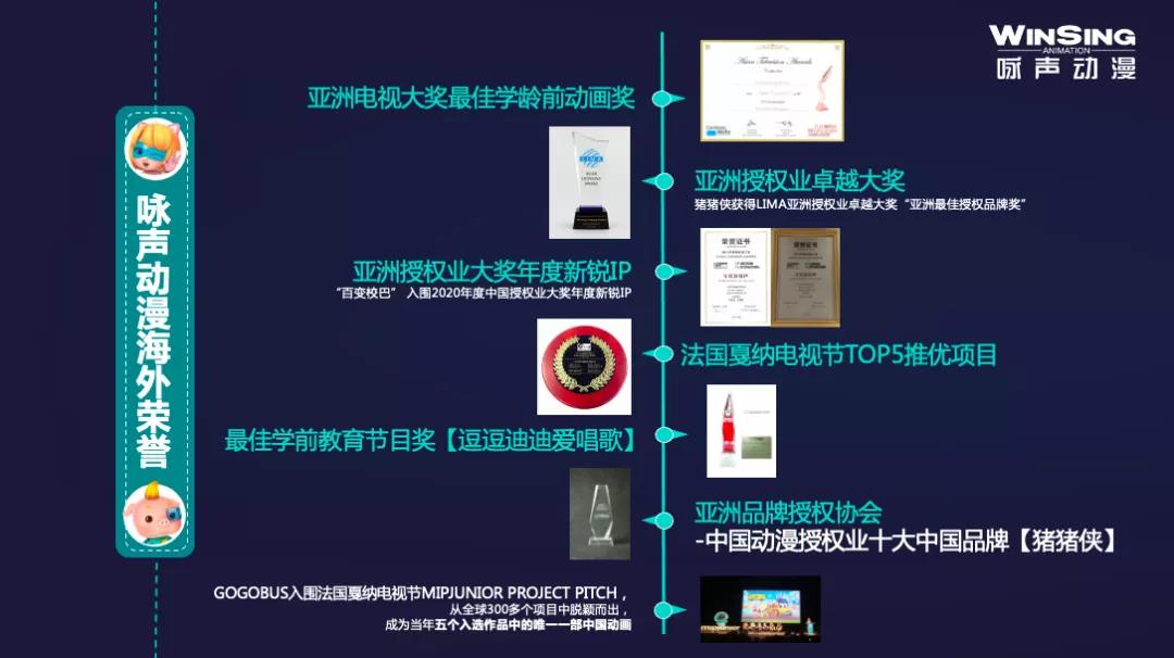 《猪猪侠》《百变校巴之超学先锋》《逗逗迪迪》等不少作品还获得亚洲电视大奖最佳学龄前动画奖、亚洲授权业大奖、亚洲授权业年度新锐IP、法国戛纳电视节TOP5推优项目等多个国际奖项。2019年,咏声动漫推出的动画短片《狮子学狮》,把极具岭南特色的中国传统舞狮文化带到国际舞台,受到了海外市场的关注与肯定,获得数十个国际电影节奖项。