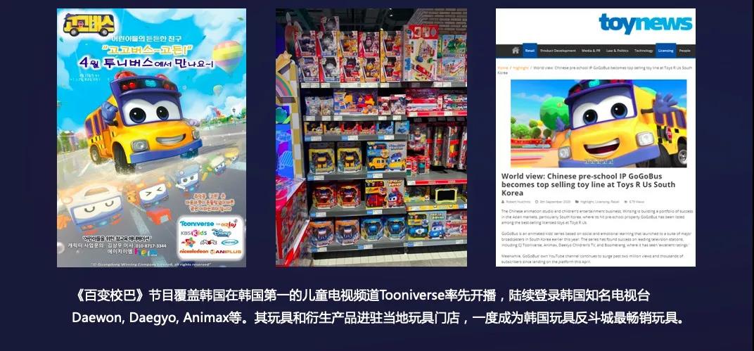2019年,咏声动漫还推出了全新动漫IP“百变校巴”。通过媒体传媒与玩具销售相互配合,在短短一年的时间里,“百变校巴”系列玩具产品销售到韩国、越南等众多国家,2020年一度成为韩国玩具反斗城最受欢迎的玩具。
