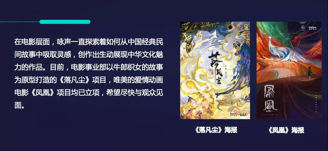 在电影层面,咏声动漫一直探索从中国经典民间故事中吸取灵感,创作出生动展现中华文化魅力的作品。目前,咏声动漫电影事业部正在以牛郎织女的故事为原型,打造动画电影项目《落凡尘》,唯美爱情题材动画电影《凤凰》项目也已立项。另一方面,咏声动漫根据中西文化差异,不断创新和调整内容和产品,用现代方式接续传统文化,用高品质的国际化表达,让海外用户更好地理解中国故事、中国精神、中国价值观。
