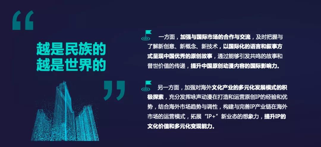 随着中国动漫在技术制作层面逐渐达到国际一线作品水准,突破地域文化差异、与欧美日韩等国际动漫强国同场竞技成为摆在中国动漫企业面前的新挑战。咏声动漫将加强与国际市场的交流合作,及时把握与了解新创意、新概念、新技术,以国际化语言和叙事方式呈现中国优秀原创故事,发掘能够引发国际观众共鸣的故事;同时,积极学习借鉴国际文化产业多元化发展模式,充分发挥咏声动漫在打造和运营原创IP的经验和优势,结合海外市场发展趋势,构建与完善IP产业链国际运营模式,提升原创动漫IP在国际市场的变现能力。