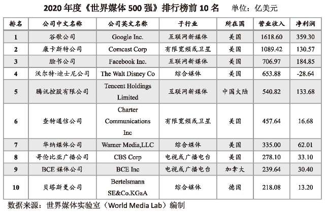 而美西方主流媒体实力雄厚,资产规模庞大。2020年12月世界媒体实验室和世界经理人集团联合发布的2020年度(第八届)《世界媒体500强》排行榜显示,2019年,全球收入前10的传媒机构中,9家来自美西方国家,其中美国7家,中国只有1家,排名前4的均为美国传媒企业(见下表)。在进入前10的传媒机构中,传统媒体7家,其中美国5家,加拿大和德国各1家,互联网新媒体3家。
