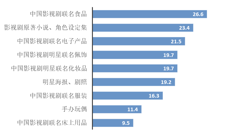 通过视听作品,可以有效提高中国产品的品牌认知度。有关东盟五国中国电视剧受众调查研究显示,在中国电视剧中出现的各类中国元素符号,中国城市受关注度最高,近四成受众表示,会“持续关注”或有“去旅游的计划”;其次是中国家电、手机品牌,近四成受众会“持续关注”或有“实际购买的行为”;通过中国电视剧关注中国汽车、服装和美食品牌的受众也占到一定比例(见表1)。在东南亚受众中,购买过电视剧中出现的食品的观众比例最高,原著小说、角色设定集的购买比例居第二位,购买剧集中出现的电子产品、明星佩饰与化妆品、明星海报剧照的比例紧随其后(见图2)。