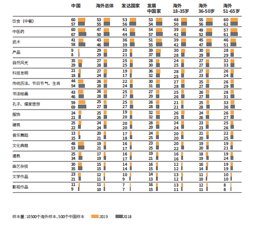 当代中国与世界研究院发布的《中国国家形象全球调查报告2019》显示,海外受访者认为最能代表中国文化的是中餐(53%)、中医药(47%)和武术(43%),其中36岁以上的受访者对此格外认同;2018年相比,受访者认为中国的科技发明代表中国文化的占比为27%(见图3)。